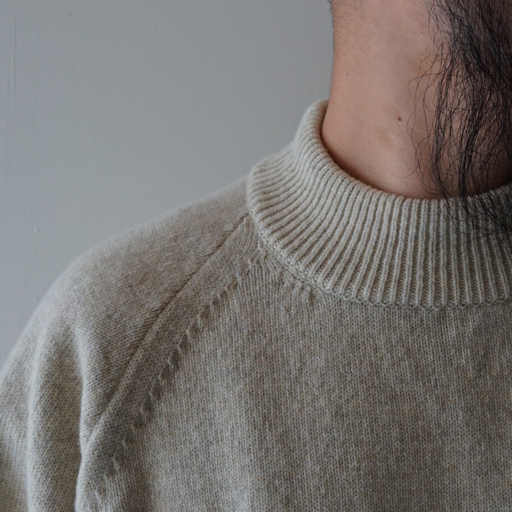 柔らかな風合いに拘って、繊維の細いウールを3本撚糸したミックス杢カラーのハイネックプルオーバー。